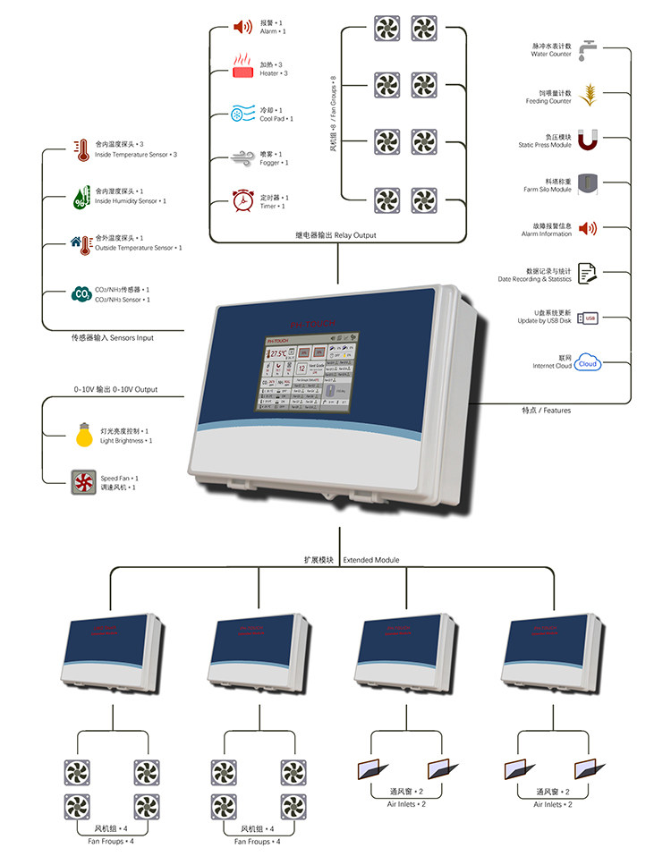 PH-TOUCH 是我公司推出的新一代禽舍環(huán)境控制器,采用7寸觸控顯示屏,最多到16組風(fēng)機(jī)組,24級(jí)通風(fēng)級(jí)別,多達(dá)31組繼電器輸出,模塊化的設(shè)計(jì),滿足不同用戶的需求。
